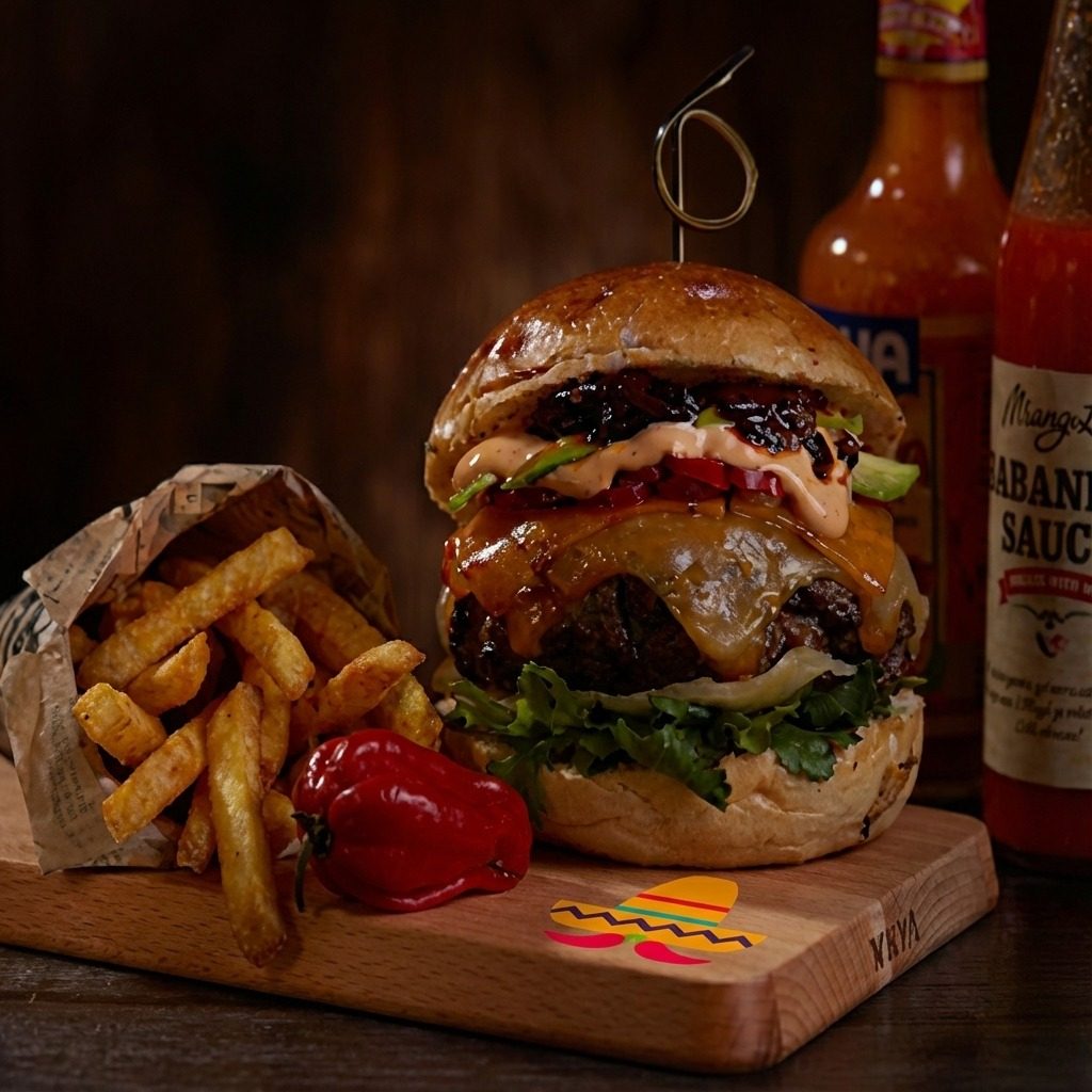Nuestra Hamburguesa Mexicana combina carne 100 % de res, queso derretido, jalapeños frescos, cebolla caramelizada y una salsa secreta con toques picantes que te transportan directo a las calles de México.